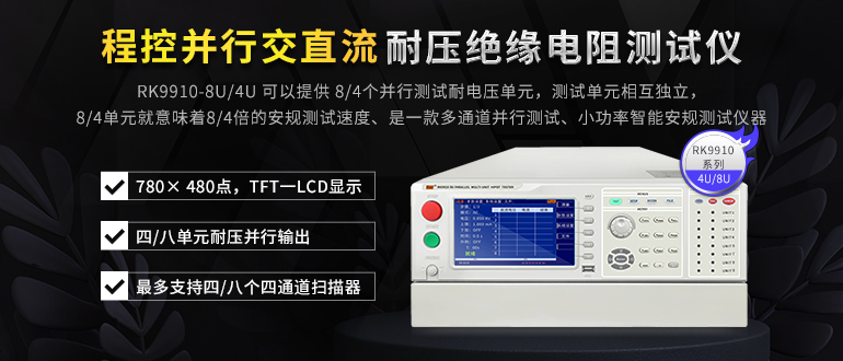 日期:2022-08-11RK9910-4U/8U系列是多路交直流耐压绝缘测试仪,是一款多通道并行测试、小功率智能安规测试仪器。实 现多个产品同步测试,按路分别判断测试结果。 可以大大加快产品测试速度,更方便配合自动化设备实现快速测试 -