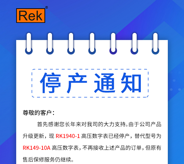 由于公司产品升级更新,现RK1940-1 高压数字表已经停产,替代型号为 RK149-10A高压数字表,不再接收上述产品的订单,但原有售后保修服务仍继续。 请各经销商,新老客户相互转告,因上述问题带来不便,敬请谅解!如有其他疑问可拨打我司服务热线 400-876-9388