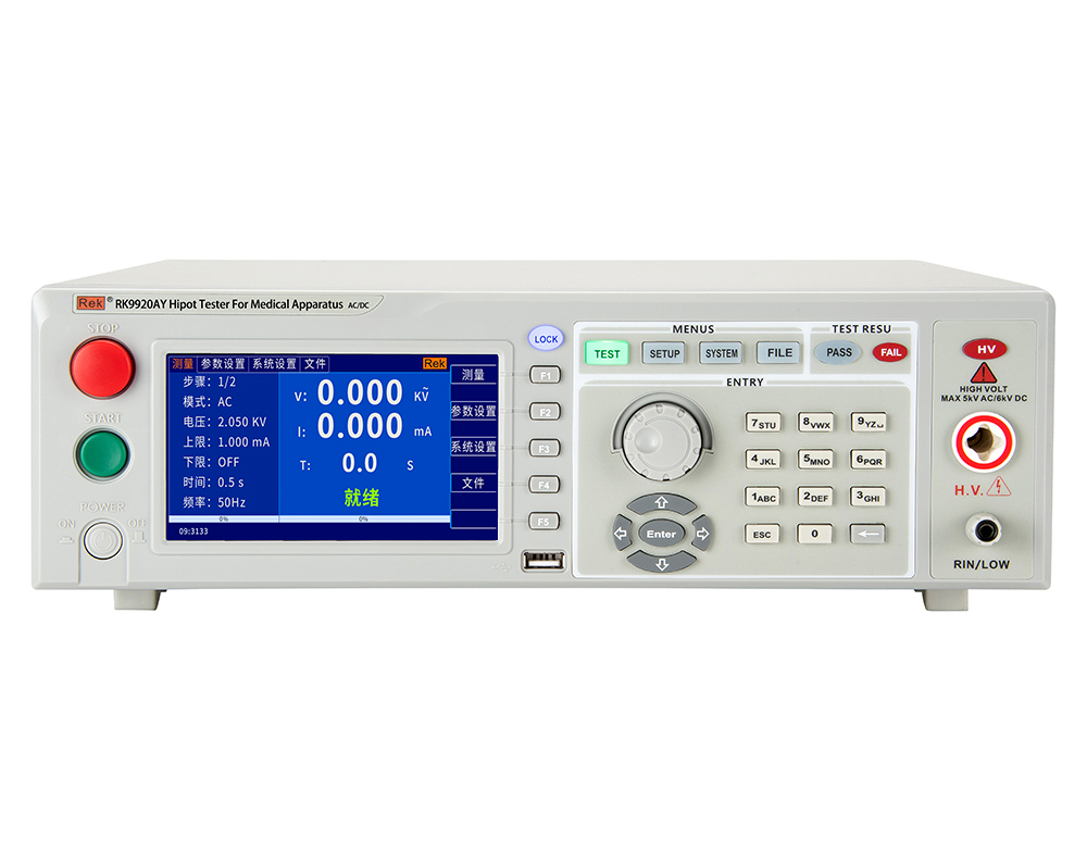 配备PLC接口、RS232C、RS485、USB device、USB Host接口,可方便与计算机或PLC组成综合测试系统。 RK99系列程控医用耐压测试仪具有常规耐压测试仪所有功能外,增加了电弧(闪络)侦测功能,